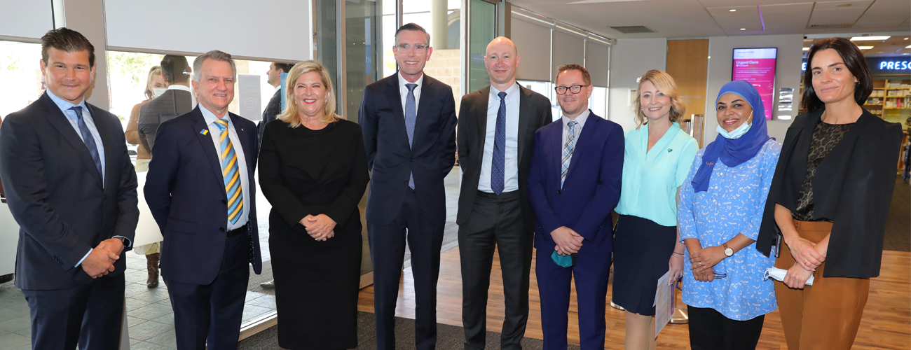 Ray Messom (CEO WentWest), Dr Harry Pope (Lead GP), Bronnie Taylor (Minister for Regional Health), Dominic Perrottet (NSW Premier), Andrew Cohen (CEO ForHealth), Simon Cross (General Manager), Diane Lowe (Practice Manager), Dr Layla Yasmeen (GP), Jasmin Ellis (General Manager Integrated and Community Health, WSLHD)