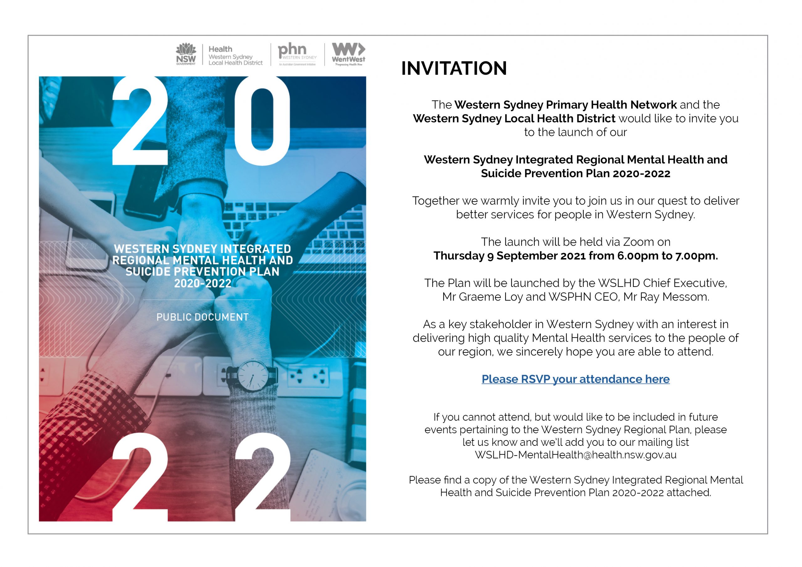 On the 9 September, the Western Sydney Primary Health Network and the Western Sydney Local Health District will be launching the Western Sydney Integrated Regional Mental Health and Suicide Prevention Plan. The Plan will be launched by the WSLHD Chief Executive, Mr Graeme Loy and WSPHN CEO, Mr Ray Messom. All health professionals and interested stakeholders are invited to attend as we commit to improving mental health services in our region.